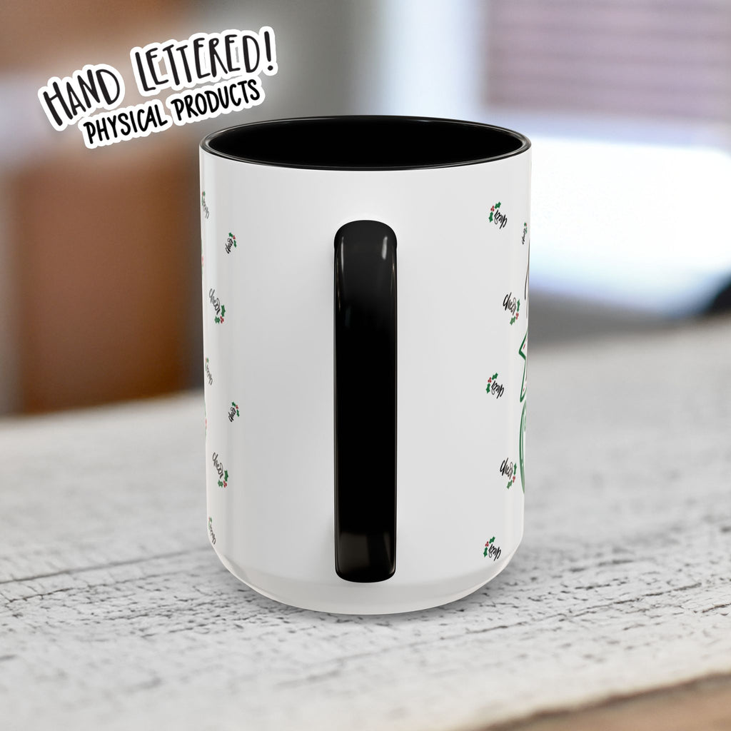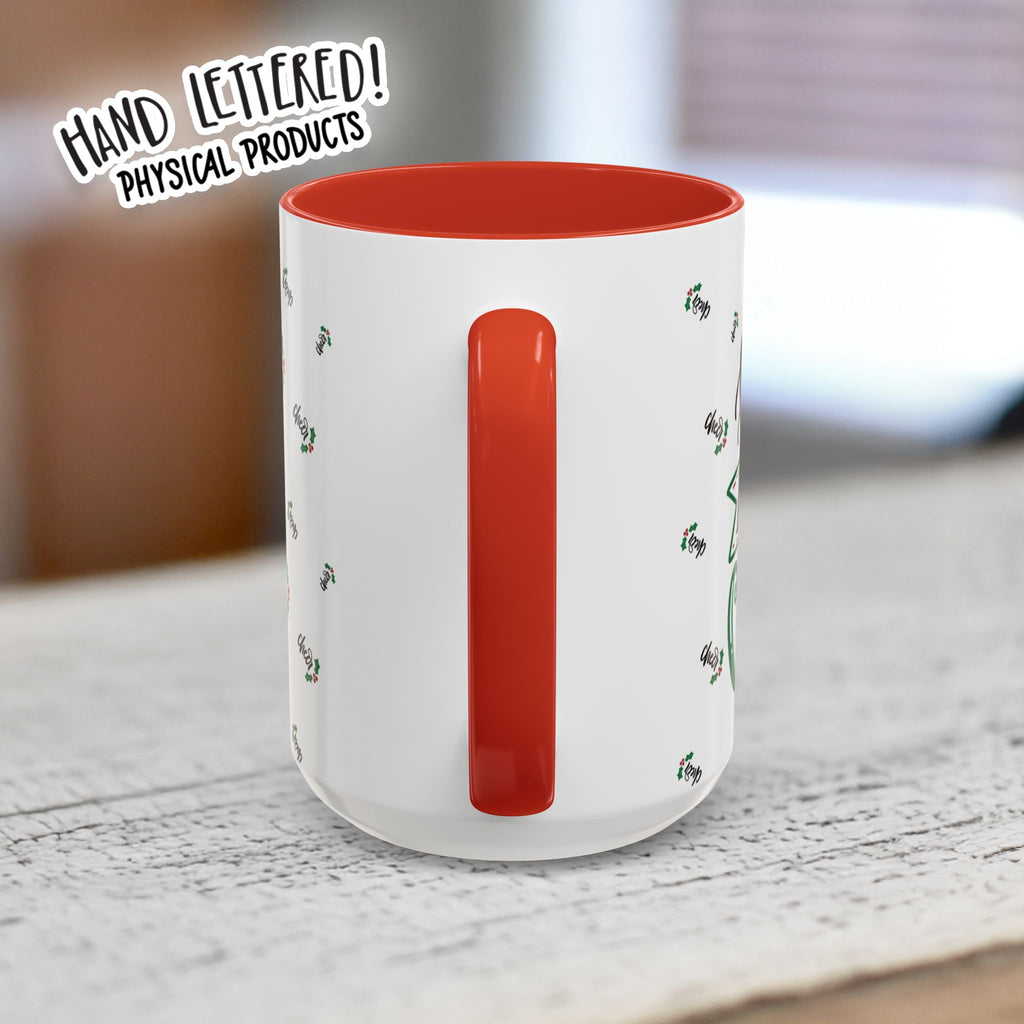 Start your day with a splash of color and personality with this hand lettered accent Coffee Mug. Crafted from durable white ceramic, this mug features a vibrant colored interior and handle that elevates your coffee experience. Enjoy its glossy finish and eye-catching color contrast while sipping your favorite brew. Perfect for at-home enjoyment or brightening up your office desk, this mug adds a joyful vibe to any setting. Ideal for coffee or tea lovers, it’s also a thoughtful gift for birthdays, housewarmings, or holidays like Christmas and Valentine's Day. Embrace the joy of every sip with a mug that showcases your unique style! Black mugs are shown in the display pictures as 11 oz mugs, red mugs are shown in 15 oz mugs.