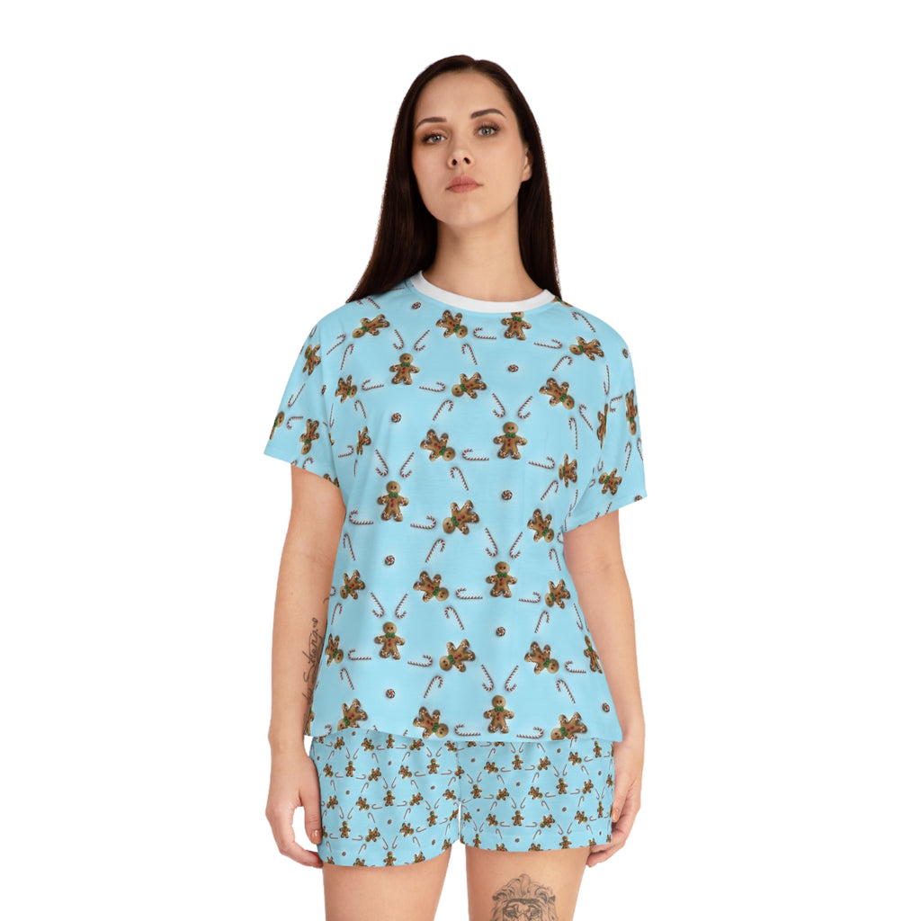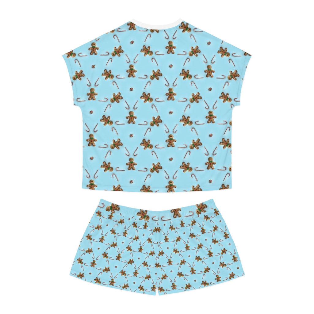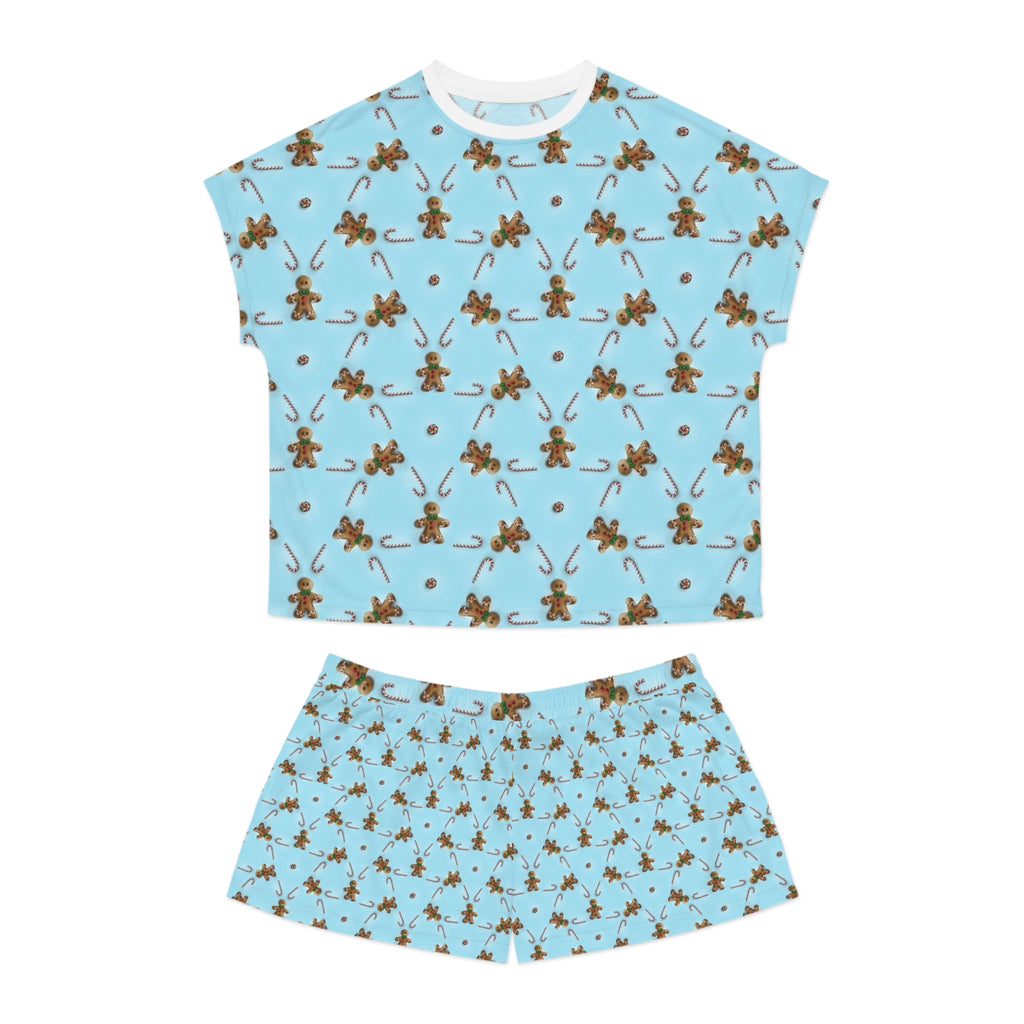 Slip into cozy whimsy with this relaxed-fit pajama set that feels like a gentle winter evening at home. Perfect for curling up with a cup of coffee or drifting off after a long day, this set features a hand drawn playful pattern of tiny gingerbread figures and candy canes on a cool sky-blue background. The ribbed collar and elastic waistband provide comfort for sleep and lounging, making it ideal for slow mornings and cozy nights. Relevant for the holiday season and anyone who enjoys festive warmth and nostalgic charm. Product features - 100% polyester and 100% cotton collar for durability - Ribbed collar for clean garment lines - Elastic and soft waistband for a comfortable fit - No sleeve seams for an oversized look - Material: 95% polyester, 5% spandex Care instructions - Do not dryclean - Iron, steam or dry: low heat - Do not tumble dry - Do not bleach - Machine wash: cold (max 30C or 90F) Hand drawn design by The Smudge Factory®.