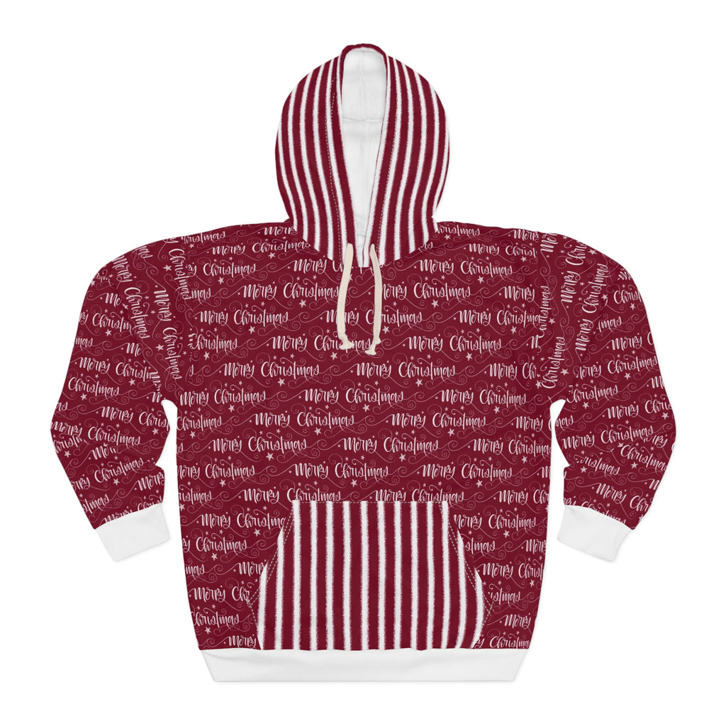 Wrap yourself in a cozy, color-rich hoodie that brings a warm holiday hum to slow mornings and late-night carols. The deep cranberry canvas is covered in hand-lettered “Merry Christmas” scripts and delicate festive motifs that feel like a familiar song — soft, familiar, and a little whimsical. The roomy kangaroo pocket and adjustable hood make it a go-to layer for chilly porch chats, tree-shopping runs, or movie-night marathons with friends and family. Because the print covers every inch, the pattern reads like a seasonal sweater rewritten in modern, wearable art.